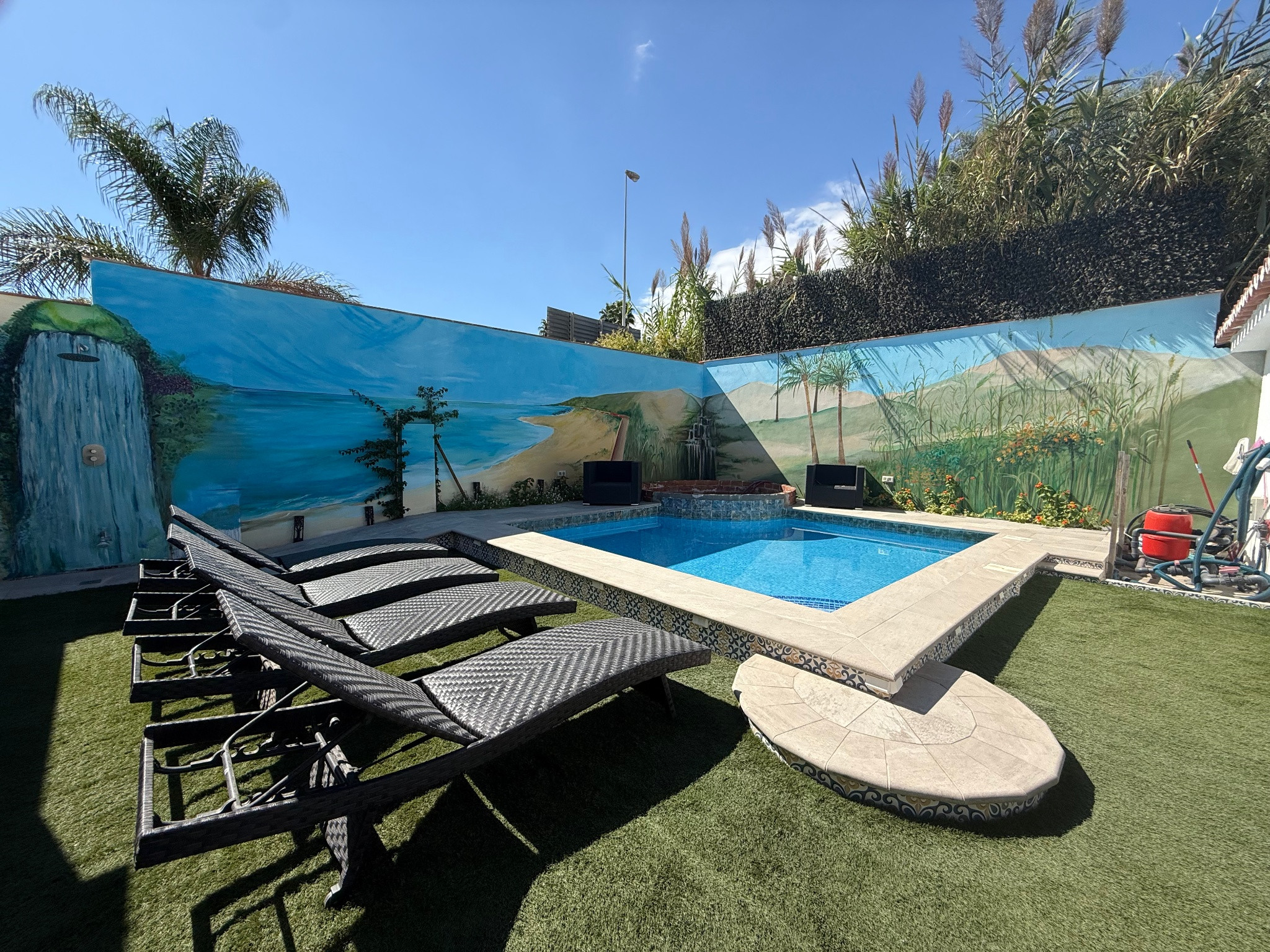 Guests have exclusive access to the entire property, including the private pool and sunny garden area.