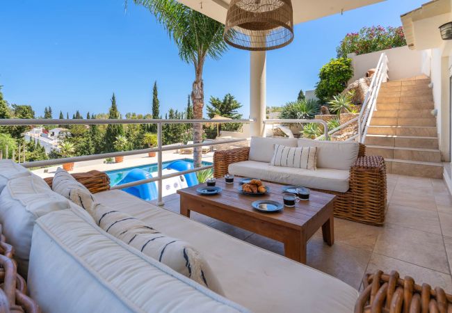 Only 18 mins drive from Malaga airport. The spacious residence extends over two floors with panoramic views of the Mijas Mountains and the Mediterranean Sea. Four bedrooms with en-suite bathrooms and a bright living room with open kitchen provide all the possibilities for a great holiday. The covered terrace leads out to a lovely garden with pool - the perfect oasis for holiday experiences.